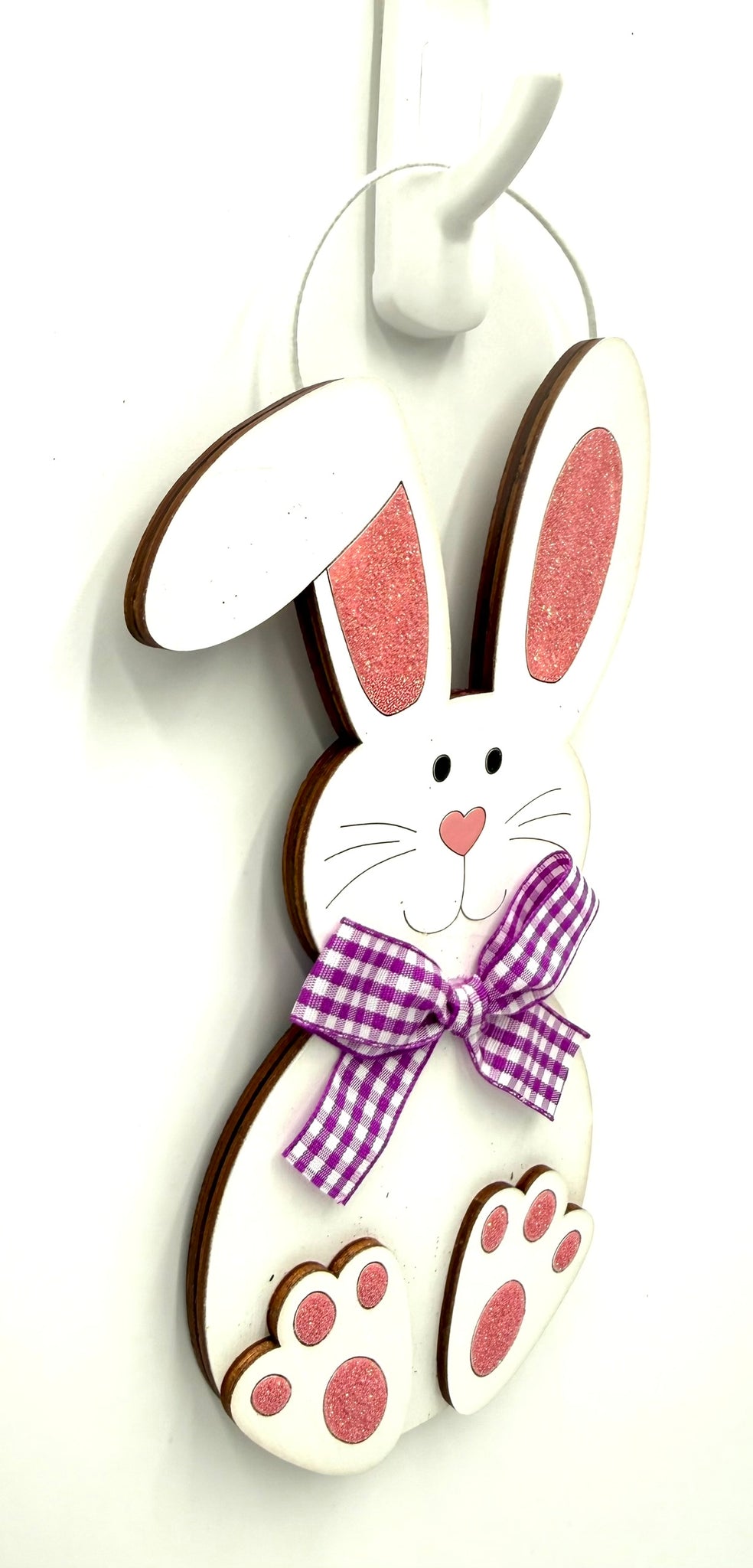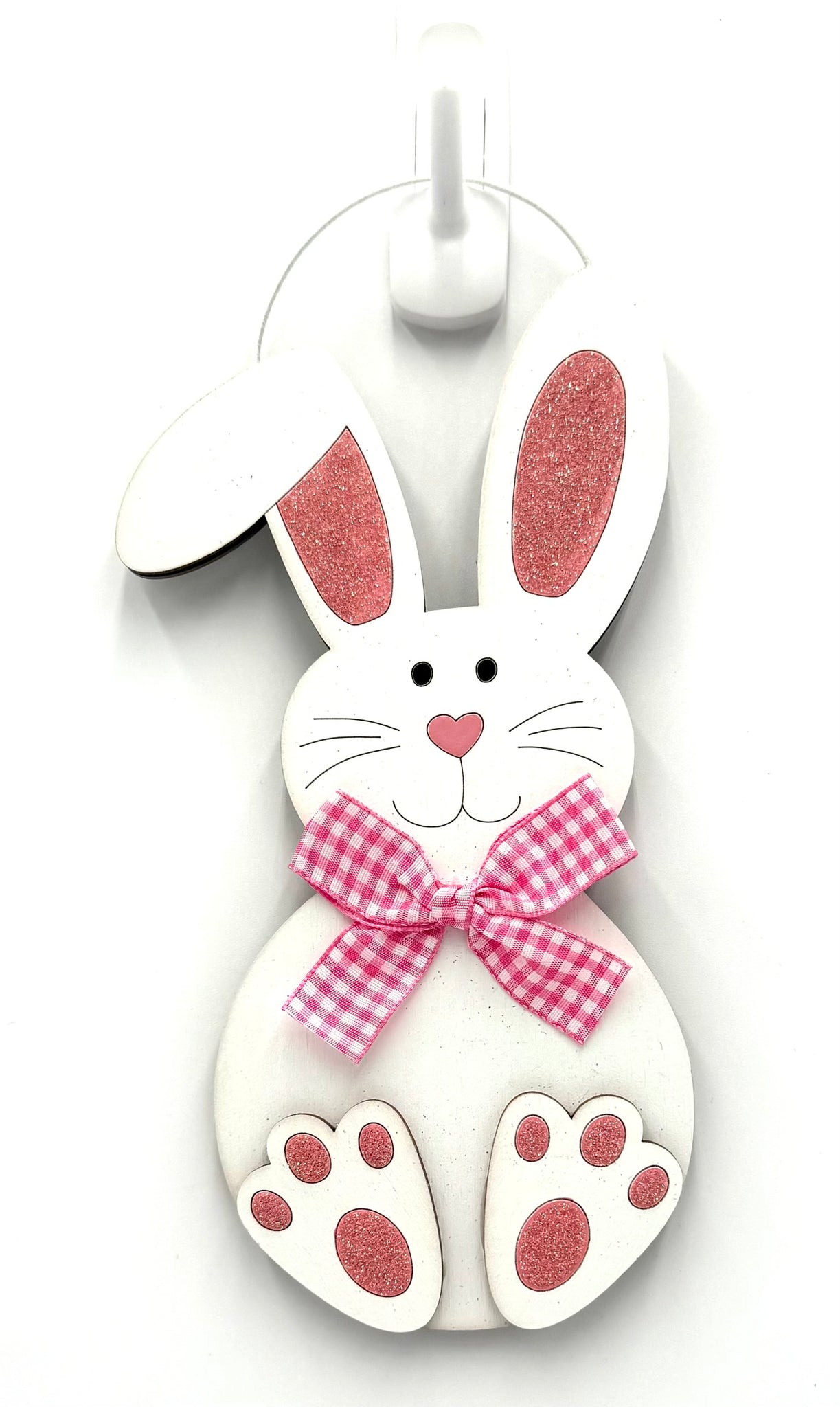 Add a sweeet , whimsical touch to your Easter celebrations with this handcrafted wooden bunny sign. Carefully hand-painted, each bunny features a ribbon bow and a touch of sparkling glitter. Bunny ornament is handmade from wood & painted with a high quality paint. Bunny's feet are separate pieces of 1/8" wood that are securely attached to the bunny body. Name is personalized with black vinyl letters on the bunnies belly. Fill in name in notes to buyer section at checkout. Proudly designed and Made in the USA!
